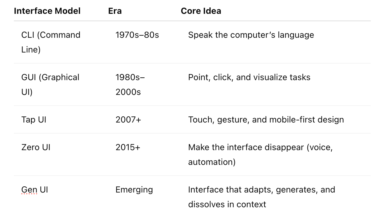 Gen UI takes the next step—bringing adaptability and real-time responsiveness into the interface itself. It doesn’t just remove or relocate the UI; it reshapes it in response to user context and system intelligence.